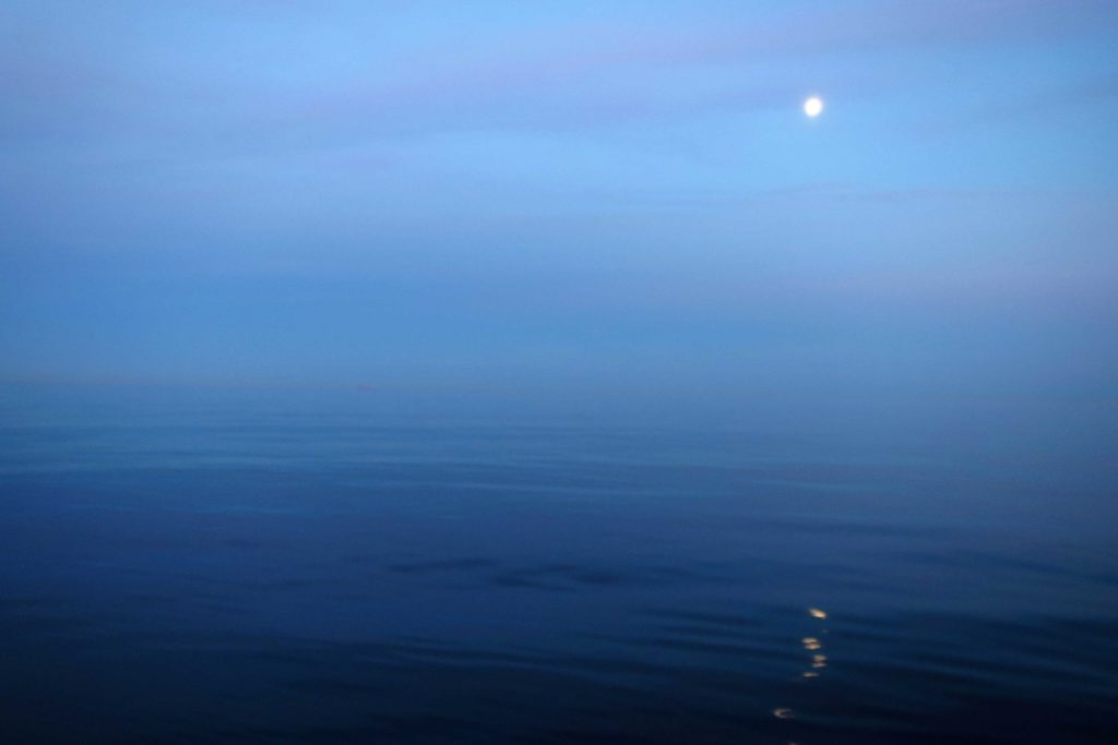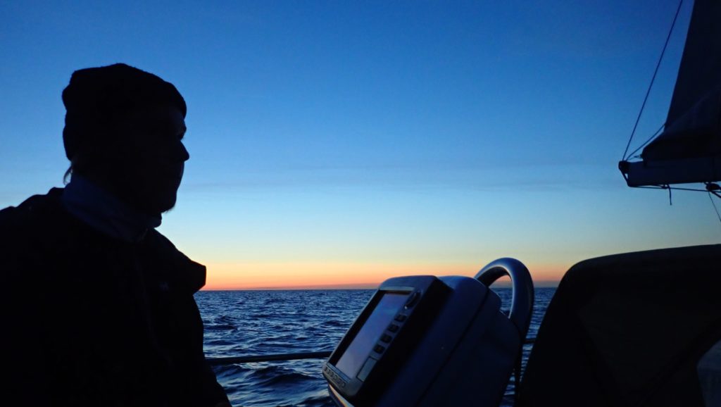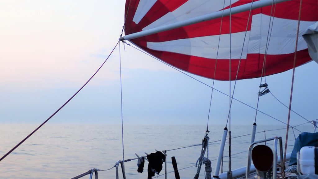 Ensimmäinen laivaväylän ylitys onnistui nappiin. Utuisessa säässä oli vaikea arvioida lähestyvien laivojen suuntaa ja nopeutta. AIS auttoi nyt paljon, siitä näki laivojen liikkeet nopeammin kuin tutkasta. Oli levollista olla liikkeellä tuulettomuuden armoilla: meri ja illan hidas hämärtyminen olivat koko maailma. Ennen pimeää laskimme vielä spinnun, sillä nyt virisi lännestä. Kun nuoret jäivät yövahtiin, Ilmatar eteni jo neljän solmun nopeudella kohti Falsterbota.