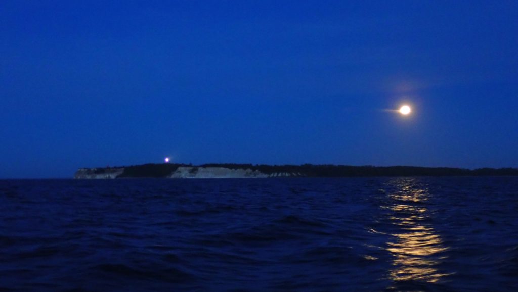 Avomerellä tuuli kääntyi pohjoiseen ja heikkeni. Auringonlaskun jälkeen noussut täysikuu alkoi yllättäen peittyä varjoon: oli siis kuunpimennyksen aika. Ilmatar eteni myötäiseen hiljaa keinuen. Keskiyöllä jouduimme jiippaamaan muutaman ylimääräisen kerran Kriegers Flakin luona sijaitsevan suuren tuulipuiston kohdalla. Taivaan alkaessa vaaleta kiersimme Kap Arkonan ohi Tromper Wiekille.