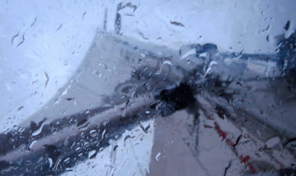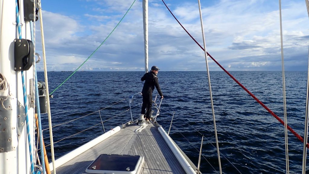 Olimme varautuneet siihen, että syvän matalapaineen häntä ehtisi vielä pyyhkäistä reittiämme. Synkät pilvet pimensivät taivaan jo ennen pimeää. Tuuli voimistui länsiluoteesta, joten pääsimme hyvin nousemaan Hiidenmaan kärkeen. Aamuyöllä oli otettava isopurjeeseen kaksi reiviä, kun tuuli kiihtyi 15 m/s asti. Ilmattaren keula halkoi menneestä myrskystä muistuttavaa korkeaa ja sekavaa aallokkoa.