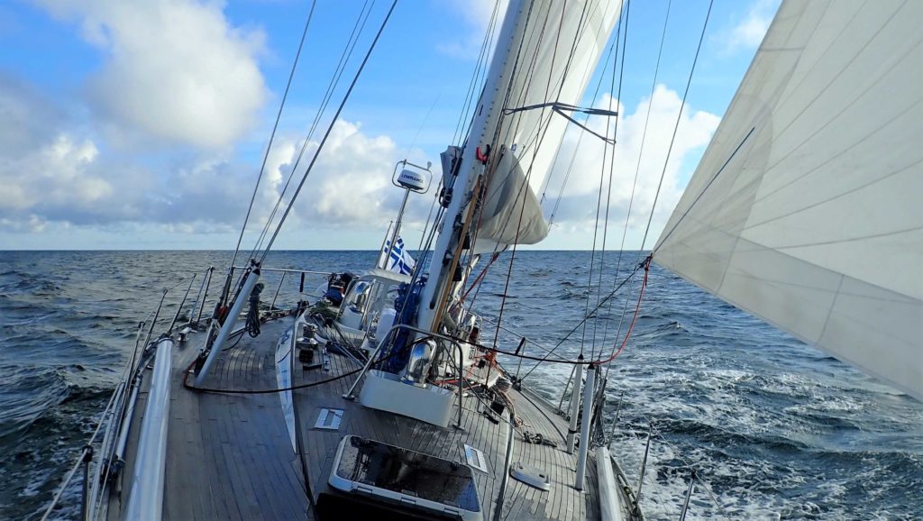 Lounaan suunnalta alkoi tulla vastaan vanhaa maininkia. Se oli varmaankin peräisin etelään ennustetusta kovasta tuulesta. Ajelimme muutamaan otteeseen koneella, kunnes kevyt läntinen vakiintui. Kolmas yö oli rauhallinen: Ilmatar lipui miltei äänettömästi sivutuuleen tähtitaivaan alla. Kauniin auringonnousun jälkeen edessä alkoi näkyä rannikosta kertovia kumpupilviä.