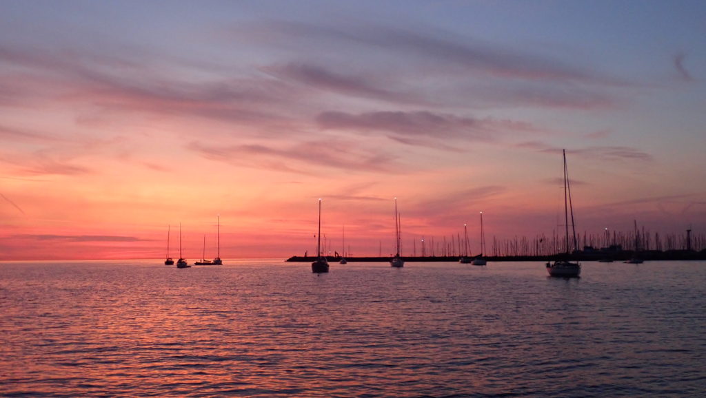 Kun moottoriongelma oli ratkennut, kaikki halusivat jatkaa matkaa, vaikka ilta oli jo pitkällä. Nopean kauppareissun ja tukevan iltapalan jälkeen kiersimme pimeät, hiljentyneet satama-altaat ja suuuntasimme vilkkuvien valopoijujen sekaan merelle. Väsyneimmät painuivat vapaavahtiin.