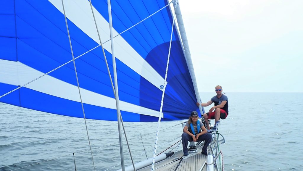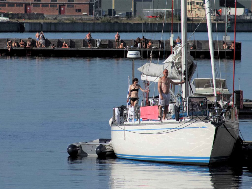 Seuraava purjehduspäivä oli edelleen lämmin mutta utuinen. Puikahdimme kalliosaarten välistä kapeaa, viitoittamatonta väylää selälle. Genaakkeri veti kevyessä sivutuulessa viiden-kuuden solmun nopeudella kohti Tanskan Læsøtä. Sää oli ideaalinen merellisiin leikkeihin. Kiinnitimme puosuntuolin veneen vierellä roikkuvaan falliin, niin että Ohto ja Anni pääsivät siinä istuen halkomaan vauhdissa vedenpintaa.