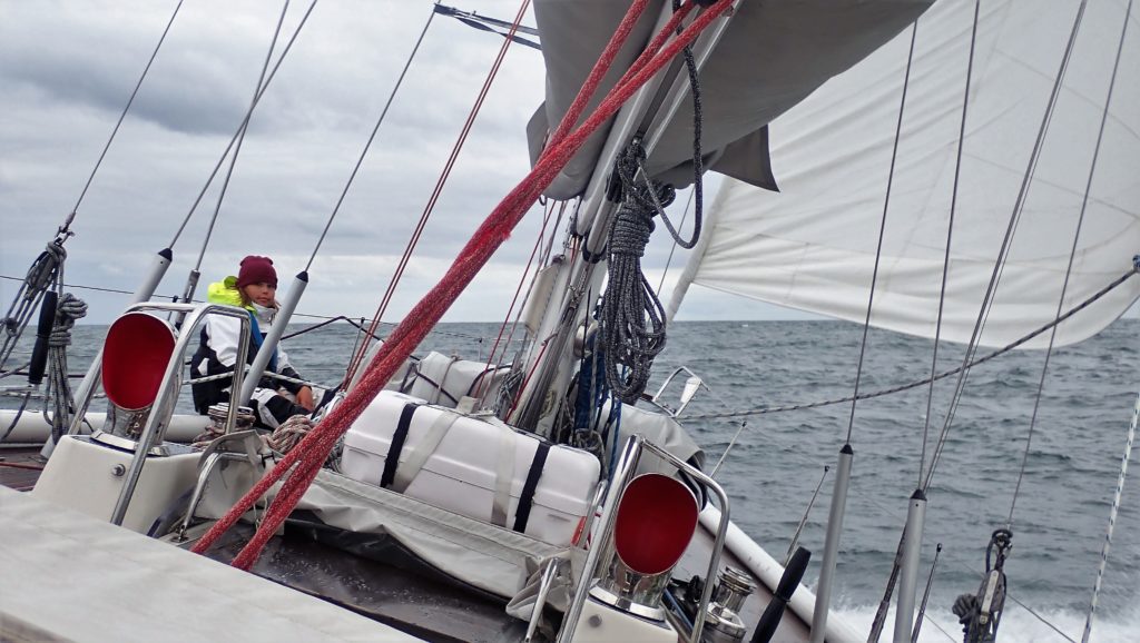 Vapaavahti tietysti löytyi ja hyvä niin, sillä aamun sarastaessa saimme ennustetun kevyen itätuulen asemesta navakkaa koillista. Reivi isopurjeessa ja reippaasti pienennetty genua rauhoittivat tilanteen. Matalan Kattegatin terävä aalto teki menosta kuitenkin kuoppaista.