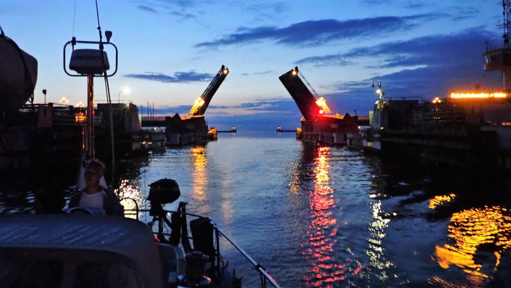 Saavuimme Falsterbon kanavalle iltakahdeksalta. Polttoainemittari toimi vain seteleillä, joten oli käveltävä pari kilometriä pankkiautomaatille. Saimme kuitenkin samalla mukaan rantaravintolan pizzat. Ne syötiin hirmu nälkäisinä heti kun silta oli auennut ja olimme päässeet kanavan läpi. Illan pimeydessä aukeni tyyni Itämeri.