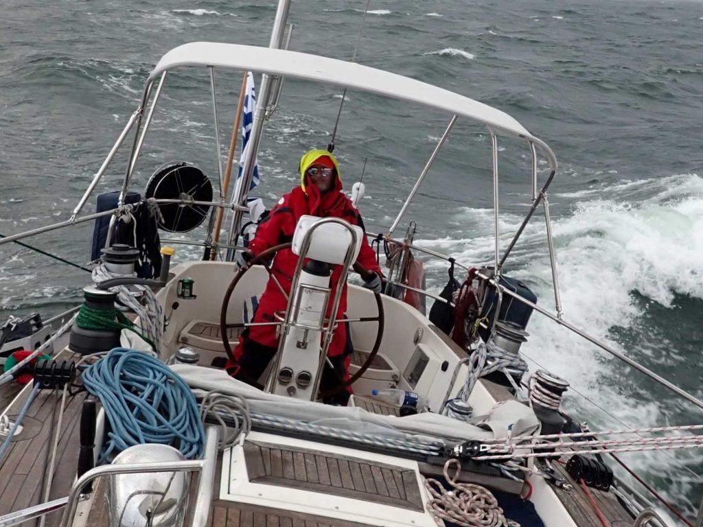 Ennen Öölannin kärkeä tuuli kääntyi koilliseen ja voimistui. Alkoi sataa. Spiirasimme genuan ja jatkoimme täysmyötäiseen. Nousin vahtiin illan hämärtyessä, Ari ja Uffe painuivat punkkaan. Vene syöksyi kuohuen ja raskaasti keinahdellen eteenpäin vellovalla merellä. Paksut pilvet pimensivät yön, rahtilaivoja tuli vastaan runsaasti. Bornholmin salmessa keskituuli oli 17 m/s. Kun vauhti nousi surffeissa 15,5 solmuun, kohina oli korviahuumaava.
