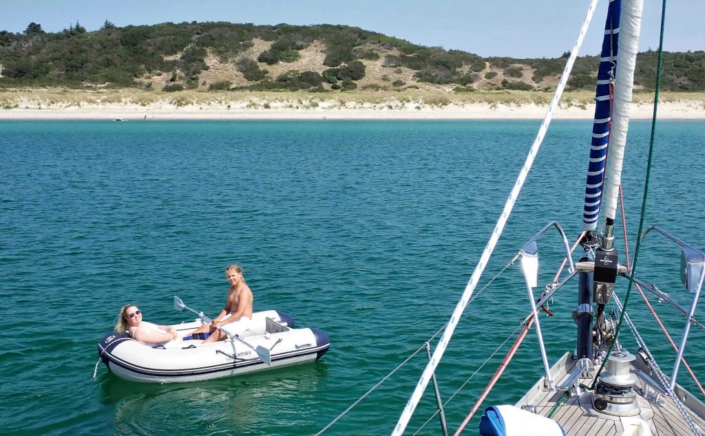 Koska Norjaan meno tietäisi karanteenia, olimme päättäneet suunnata Limfjordin läpi Pohjanmeren puolelle. Vaihtelevien rajoitusten keskellä oli paras odottaa tilanteen kehittymistä. Anholt on kauniissa säässä oikea kesäparatiisi, ja me keskityimme nyt uimiseen ja snorklaamiseen. Tyynessä yössä ympärillä syttyi parikymmentä ankkurivaloa