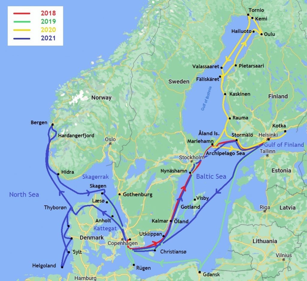 Previously, we cruised the Western Isles of Scotland, the Orkneys, and Shetland as well as Norway with our 35 ft sloop Matilda Gustava. With Ilmatar, we have now sailed the Wadden Sea in the south to the Norwegian fjords in the north.