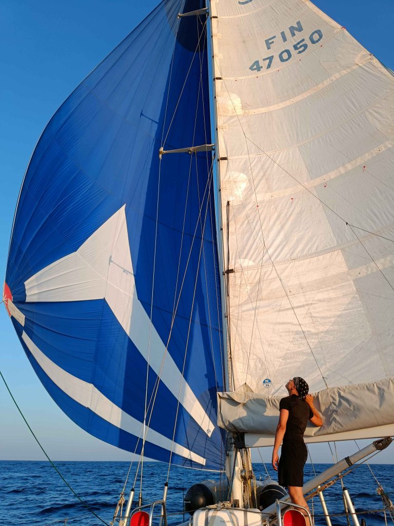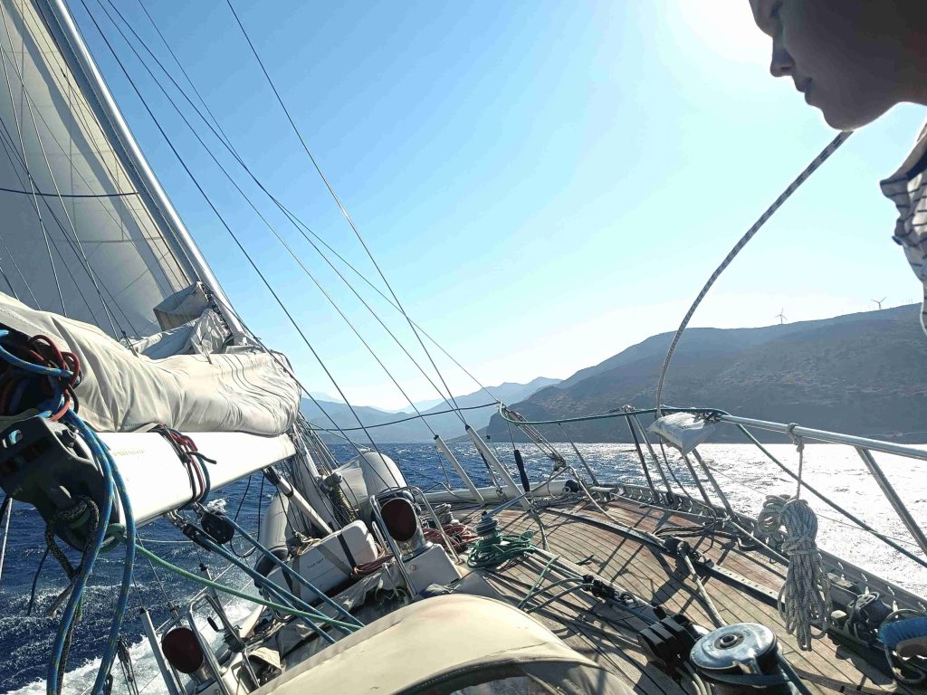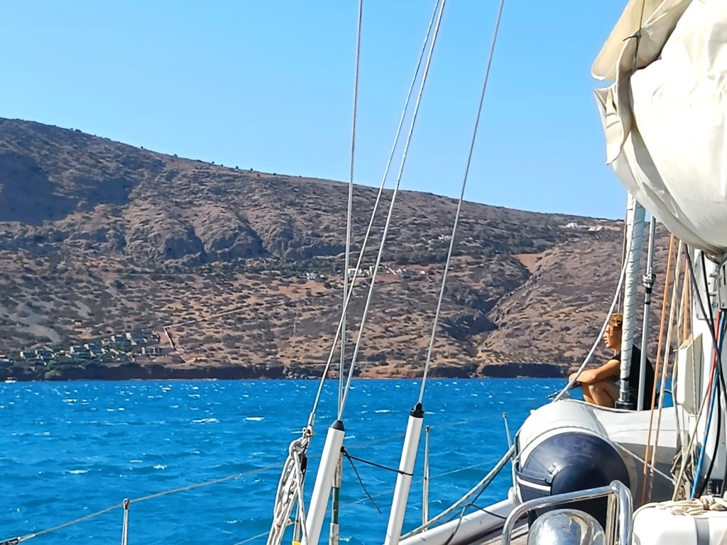 Haniasta lähdön jälkeen purjehdimme vajaan vuorokauden Kreetan pohjoisrannikkoa itään. Yöllä puhalsi kevyesti luoteesta, päivällä tuuli voimistui vähän. Code alkoi vetää mukavasti keulapuomin päässä, eikä enää ollut liian kuuma.