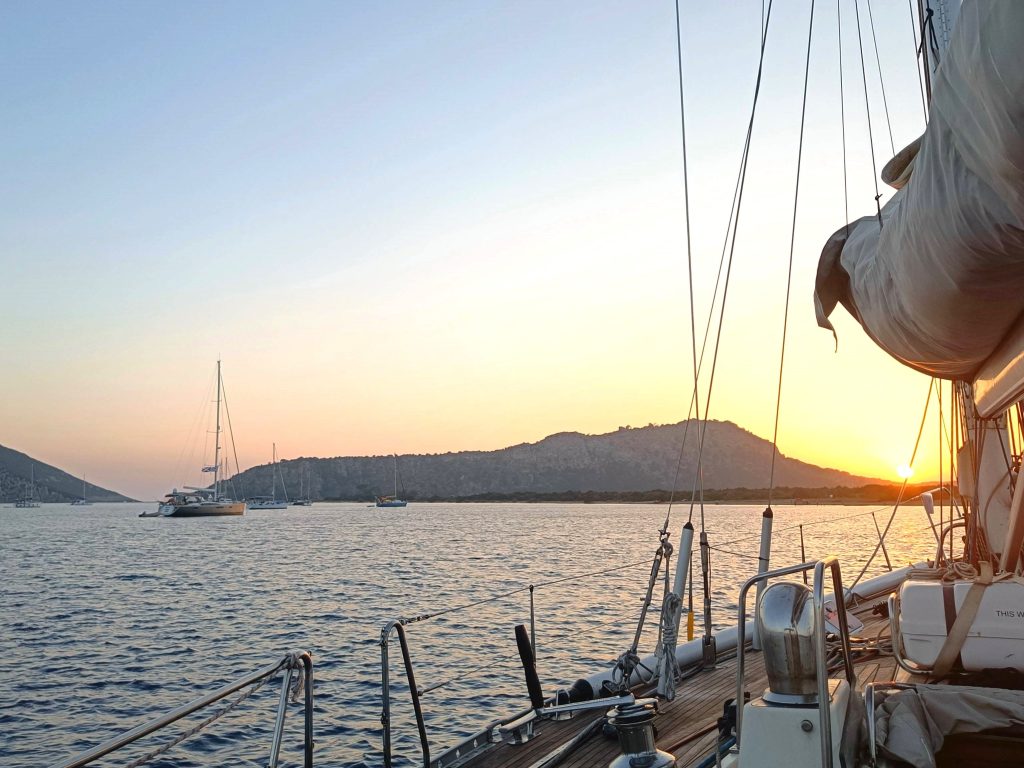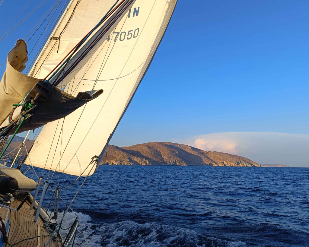Jatkoimme Symiltä eteenpäin vastatuulessa. Ennustetun luoteisen sijaan puhalsi navakka läntinen. Tämän olisi voinut ennakoida: Turkin rannikolta Egeanmereen pistävä pitkä, vuoristoinen Datçan niemimaa kääntää meltemin rannikon suuntaiseksi.