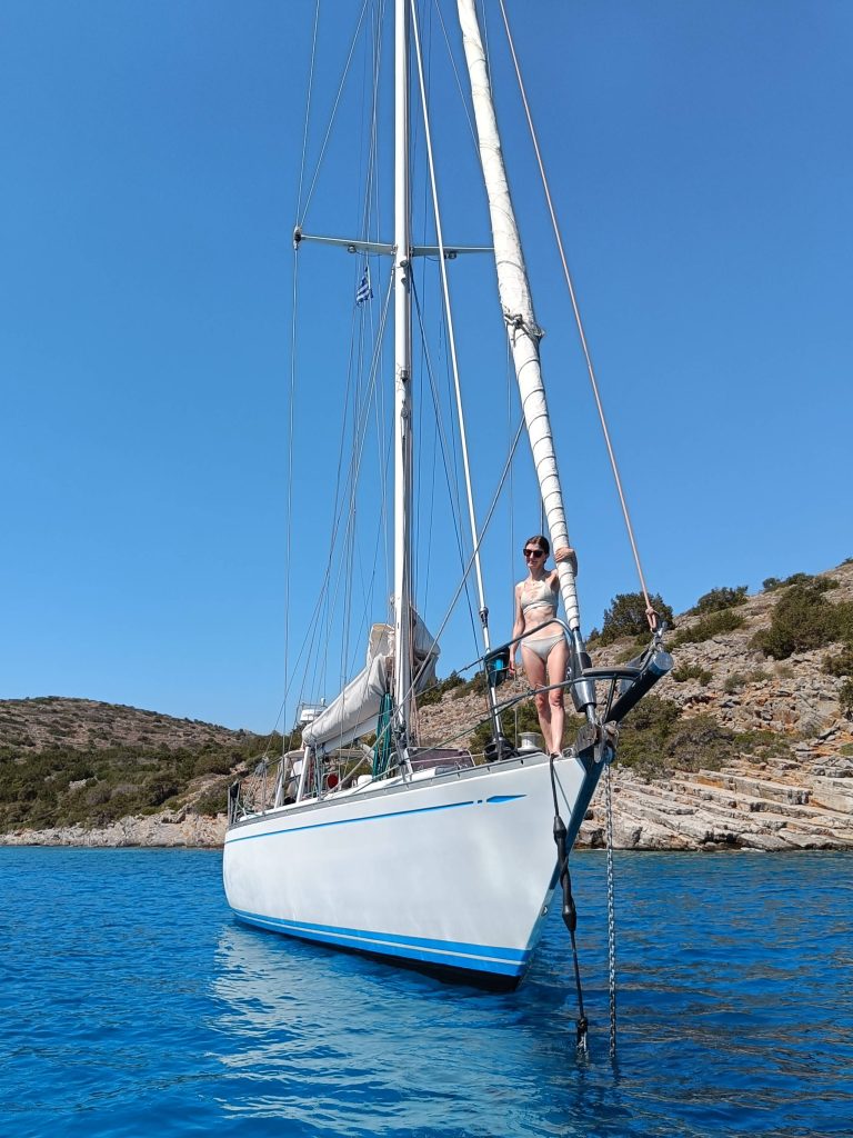 Kauniilla Skhoinosinlahdella oli paljon veneitä. Sopiva ankkuripaikka löytyi pienen, kallioiden välissä olevan hiekkarannan kohdalta. Koska tilaa oli rajatusti ja pohja syveni nopeasti, seurasimme muiden mallia ja veimme ankkurista peräköyden rantaan. Kumivene ei ollut vielä pumpattu, joten Ohto ui köyden maihin ja sitoi sen sopivaan kallioon.