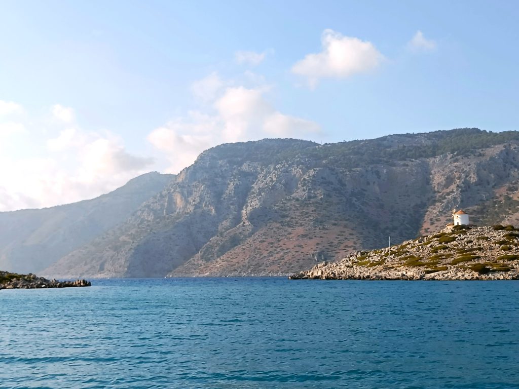 Oikealla näkyi Kreetan autereinen rannikko, vasemmalle jäi Dian kallioinen saari. Saavuimme iltapäivällä Agios Ioanniksen – eli Pyhän Johanneksen – niemimaan kärkeen, missä jyrkkärinteiset vuoret nousevat suoraan merestä.