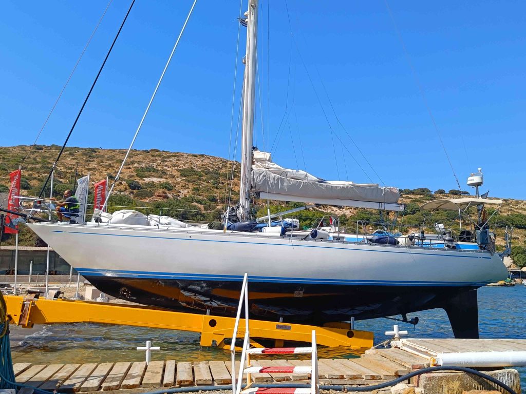 Neljä päivää on kulunut Ilmattaren nostosta maihin Artemis-telakalla. Tulimme Partheninlahdelle illan jo pimennyttyä ja kiinnityimme ohjeiden mukaisesti telakan poijuun. Aamupäivällä, ennen kuin tuuli oli ehtinyt voimistua, genua oli laskettu kannelle.
