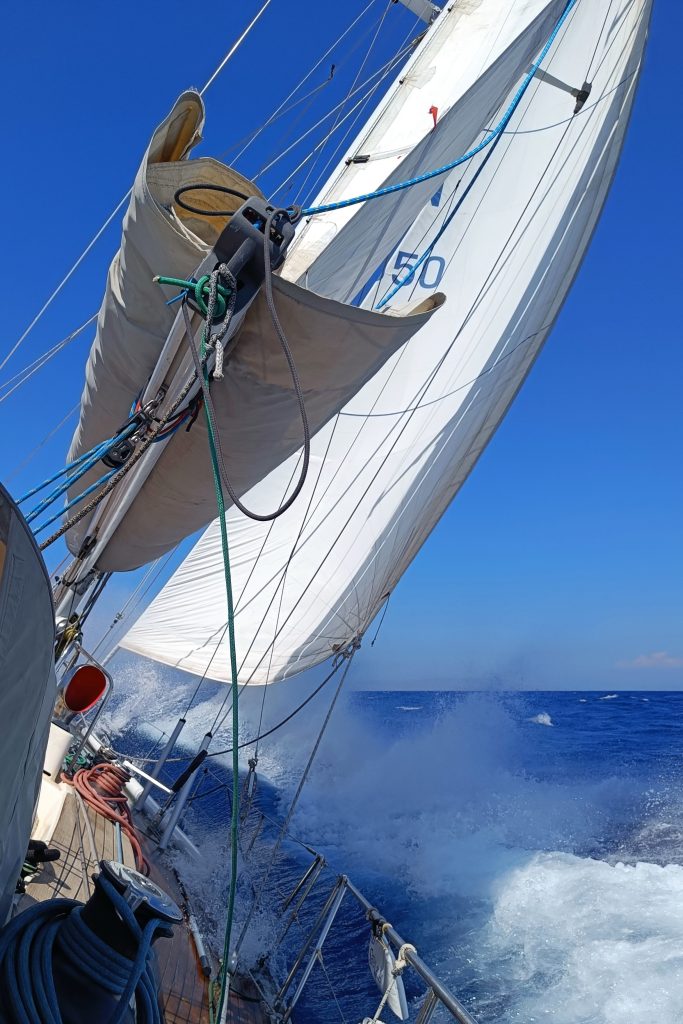 Purjehdus Kreetalta Rodokselle Karpathoksen pohjoispuolelta otti kevyissä tuulissa reilun vuorokauden. Alkumatkasta code veti sivutuulessa tasaisesti kuuden solmun vauhtia. Jäimme ihastelemaan auringonlaskua siltakannelle iltadrinkkien kanssa.