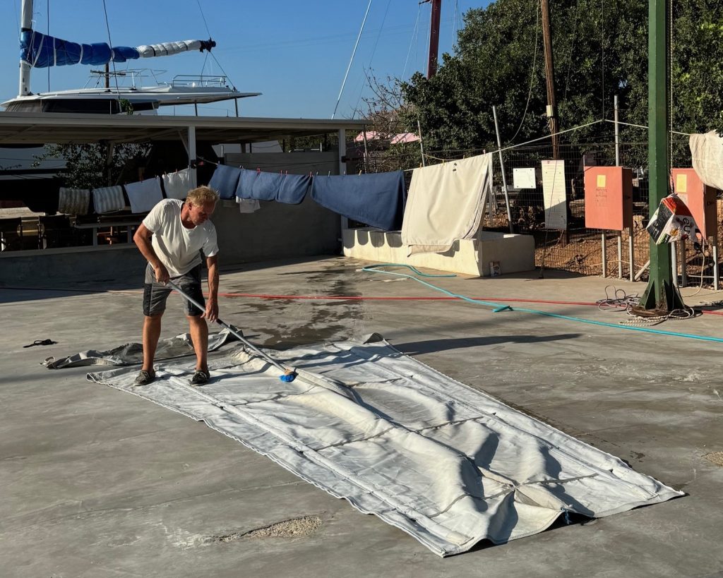 Toisin kuin Algarvessa, täällä takilasta irrotetaan turvallisuussyistä kaikki purjeet. Tilaisuuden tullen pesimme isopurjeen ja genuan tähän tarkoitukseen varatulla alueella. Samassa paikassa pesimme myös puomipeitteen ja sprayhoodin. Siellä kuivuivat myös pesutuvan koneissa pyörineet patjanpäälliset ja tyynyt.