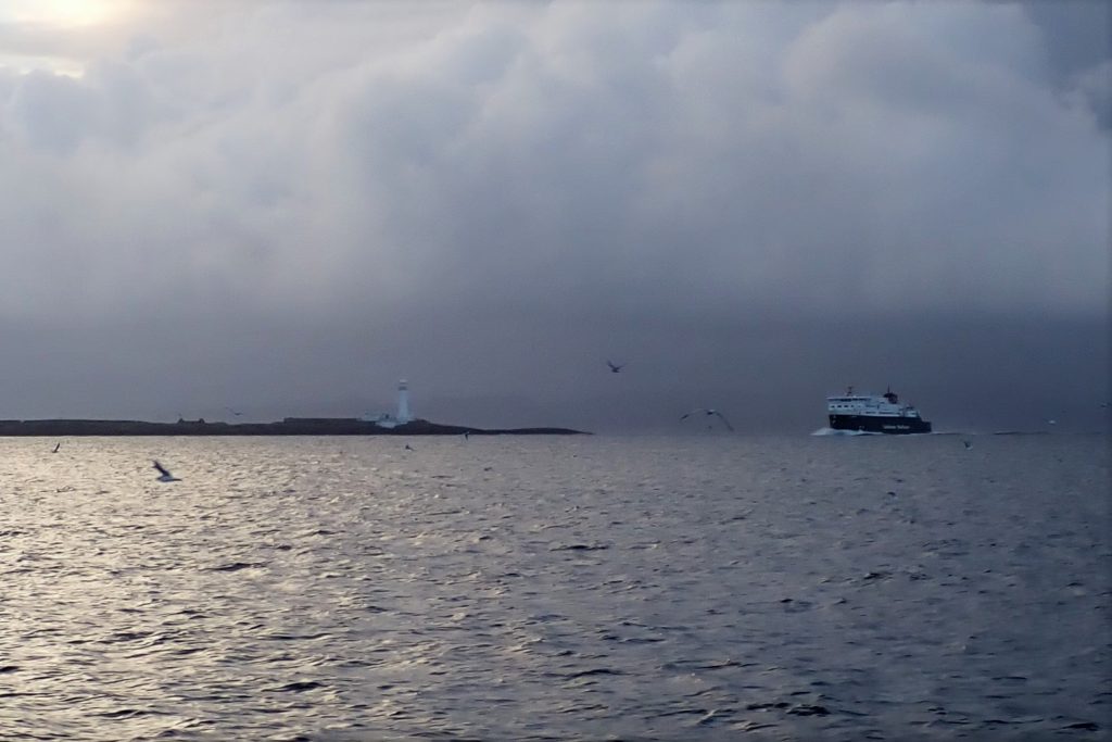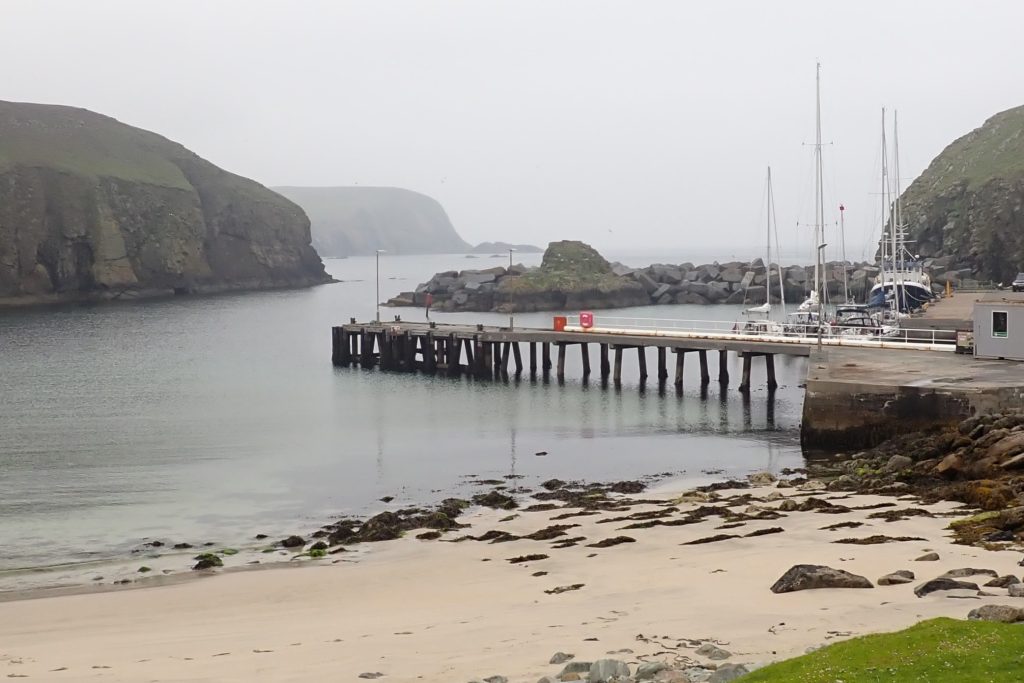 Lähestyimme Shetlantia aamuyöstä. Vesisade vaihtui sumuksi eikä Out Skerriesin majakka tullut näkyviin. Muutama maili ennen Bressayn pohjoiskärkeä näkyvyys parani ja lähestymisloisto erottui maata vasten vaalenevassa aamussa. Lerwick Port Control toivotti VHF:ssä hyvää huomenta ja tervetuloa, kiinnityspaikan saa valita itse.